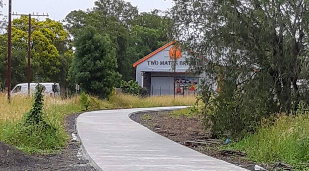 The project is well underway, on track for completion as early as October 2024 (weather permitting). The gravel portion of the trail (roughly 12 km) is complete. This surface is composed of grey DGB20 road base, which can be sealed at a later date and is cheaper than the yellow material used elsewhere, due to haulage distances. Concrete sections of the path at the Lismore train station and in town are also complete, and bridge designs are at 90%. Construction of these will begin shortly.